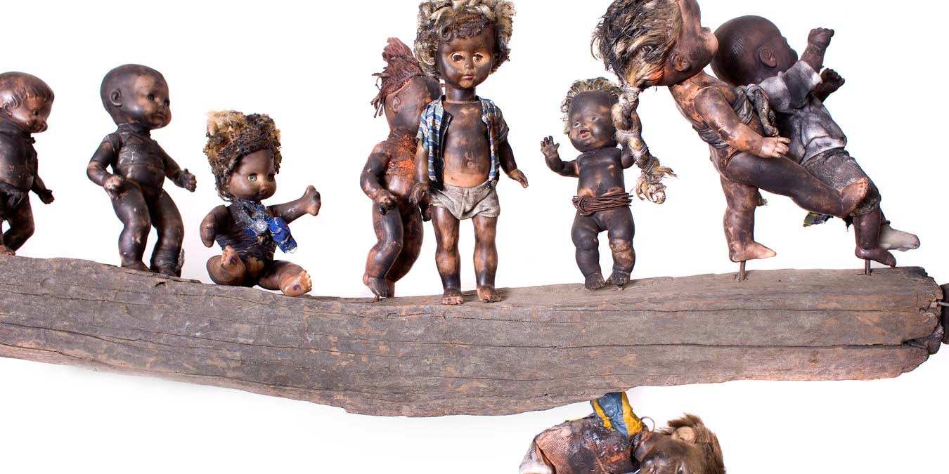 signature use of discarded dolls added to the mix of objets trouvés – that elevates