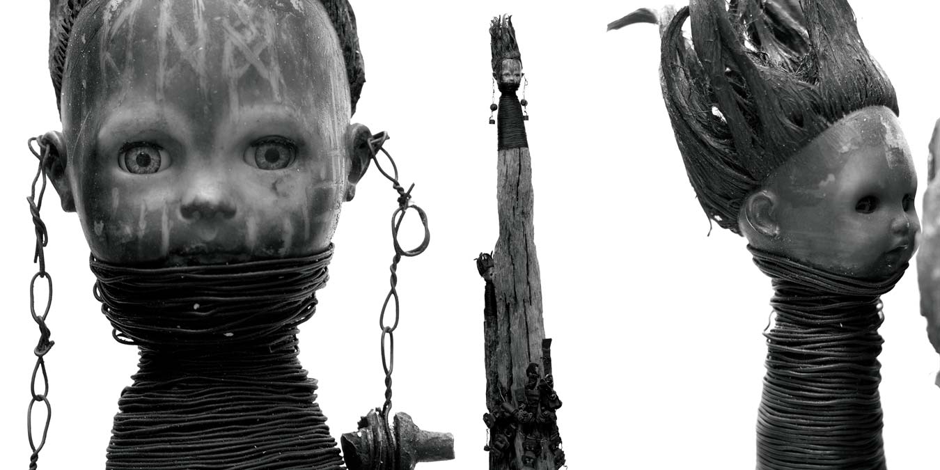 Wood, clay, metal, twine and plastic doll, 229 x 28 cm.