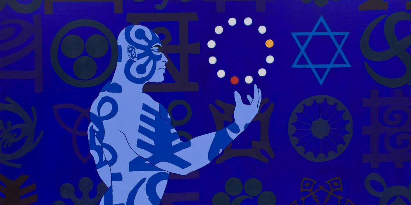 These and other ‘mysteries’ are embedded in the symbolic web of messages – both secret and exoteric – which beguile the inhabitants of these marvelously painted worlds. These icons and glyphs contain, for those who strive to decipher their hidden meanings further, Owusu-Ankomah’s musings on the wonders of this mysterious world replete with secret signs.