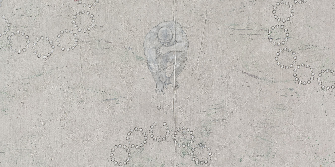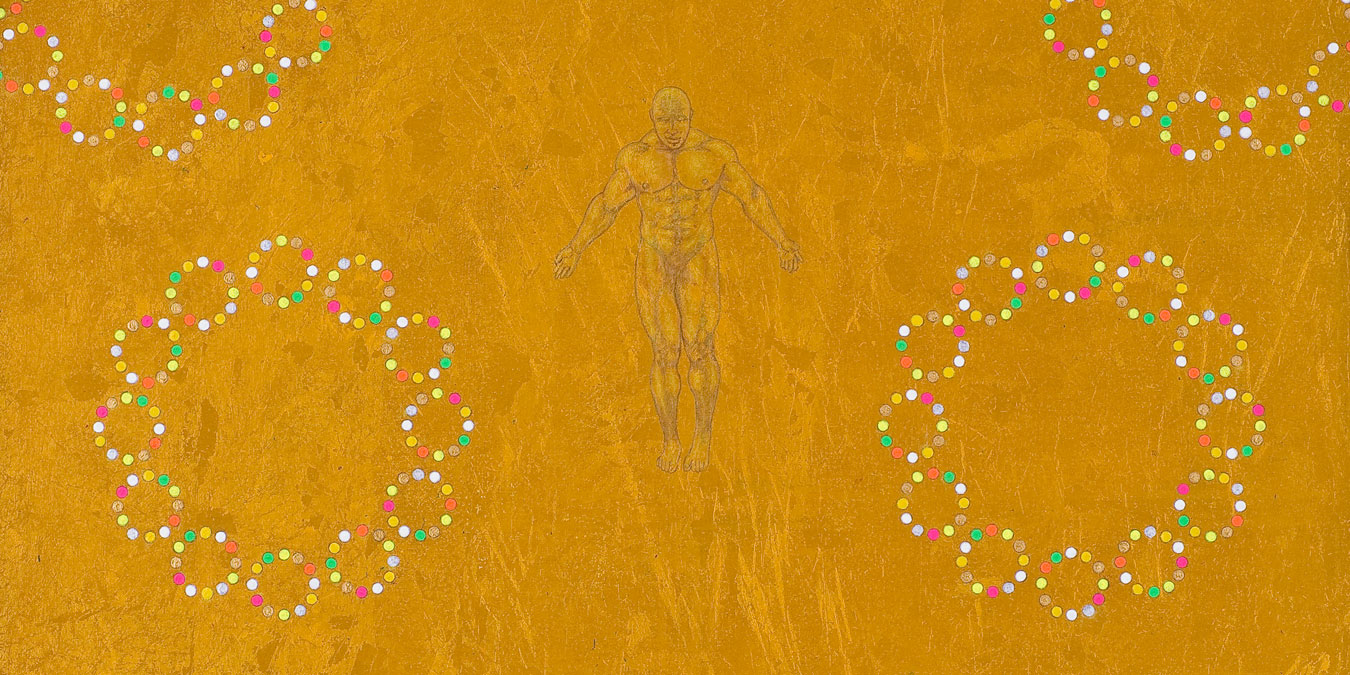 Using a palette of new colours, Owusu-Ankomah’s latest work further develops these possibilities, adding further visual signs of his own invention to the customary lexicon of adinkra symbols which each represent a particular concept used by the Akan-speaking peoples of Ghana. In the same Akan language kusum refers to sacred sites involved in the secret performances of mystery rites. Owusu-Ankomah extends his visual explorations in novel directions by developing innovative symbols, such as the Microcron – the circle of shining orbs signifying ‘universes inside universes,’ which so entrances the figure in the image above. This unique symbolic logic yokes together ancient traditions of secret knowledge with current speculation about the mysterious nature of reality derived from theoretical physics, which predicts the parallel coexistence of multi-dimensional universes within a single multiverse.