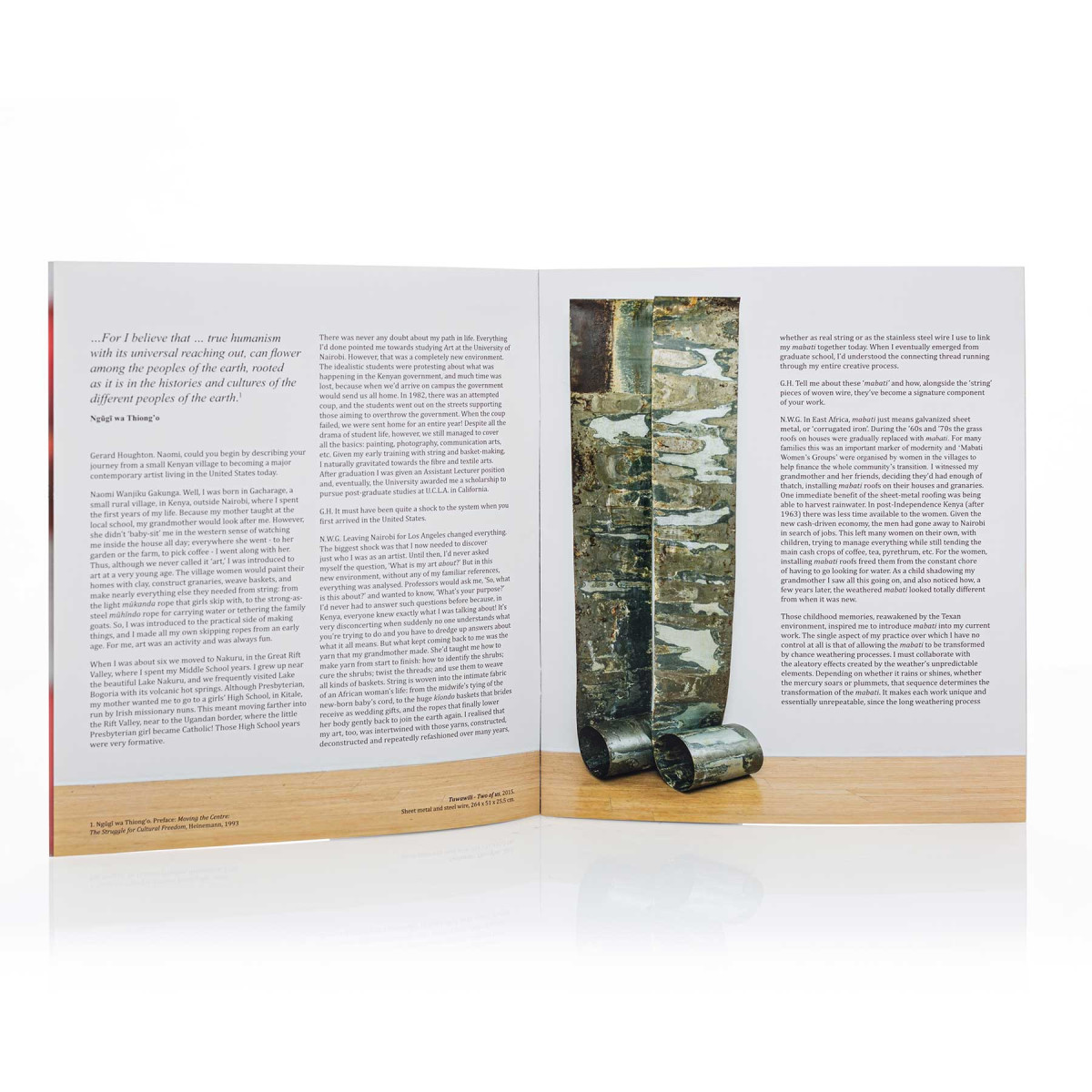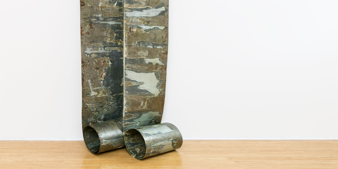 Mabati, or galvanised sheet metal, is ubiquitous in Kenya. Used mainly for roofing and building walls, this sheet metal is particularly associated with the Mabati Womens’ Groups and their empowering community housing projects of the ‘60s. Gakunga observed the success of their efforts, the harvesting of water from the new roofs and the consequent ageing of the material itself. Mirroring these weathered effects in her own artistic process, she deliberately saturates rolls of sheet metal in water, a process that oxidises the submerged surfaces, occasionally adding dyes to create different colours and other more complex effects. Tushauriane – Let’s Talk About It pushes Gakunga’s practice further, by consciously adopting new diverse materials that intertwine with her core material Mabati, she visually articulates the concept of dialogue.