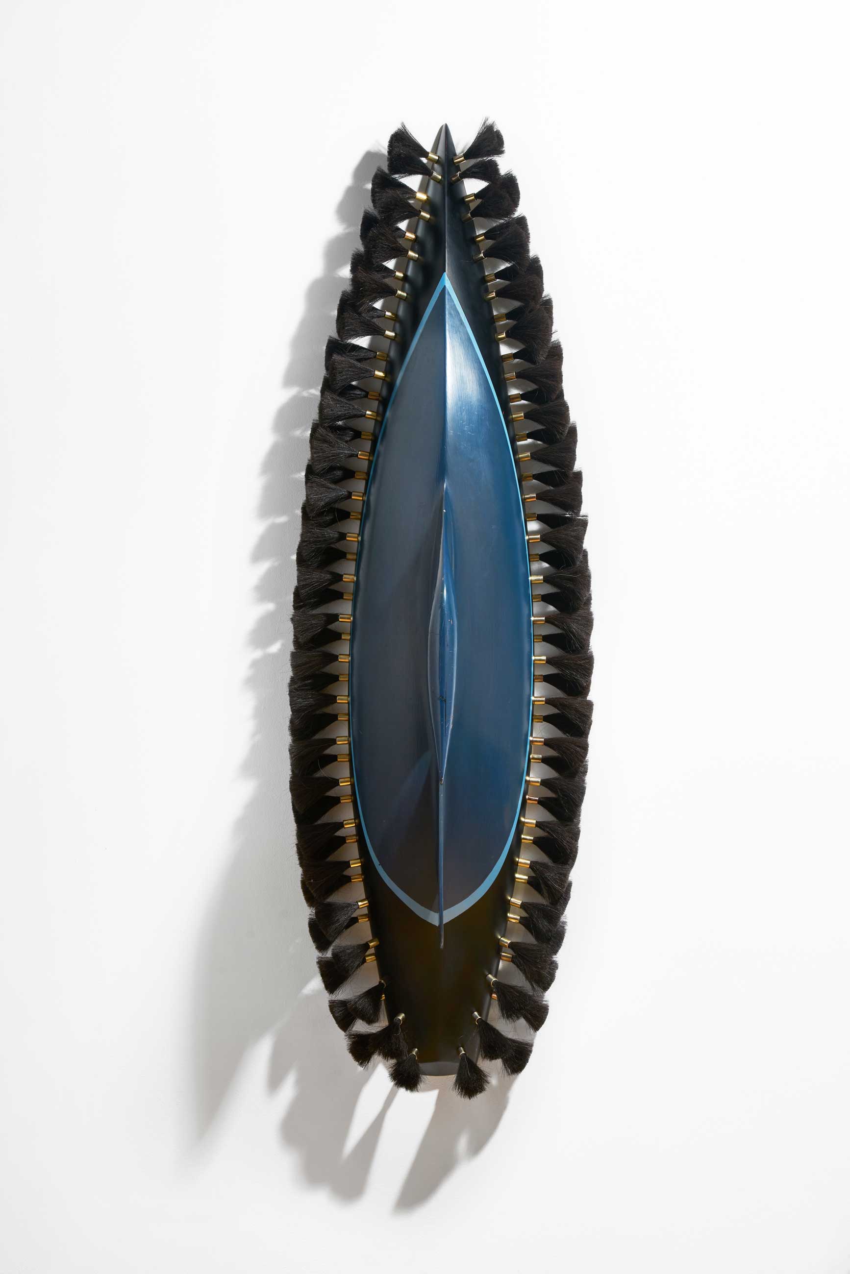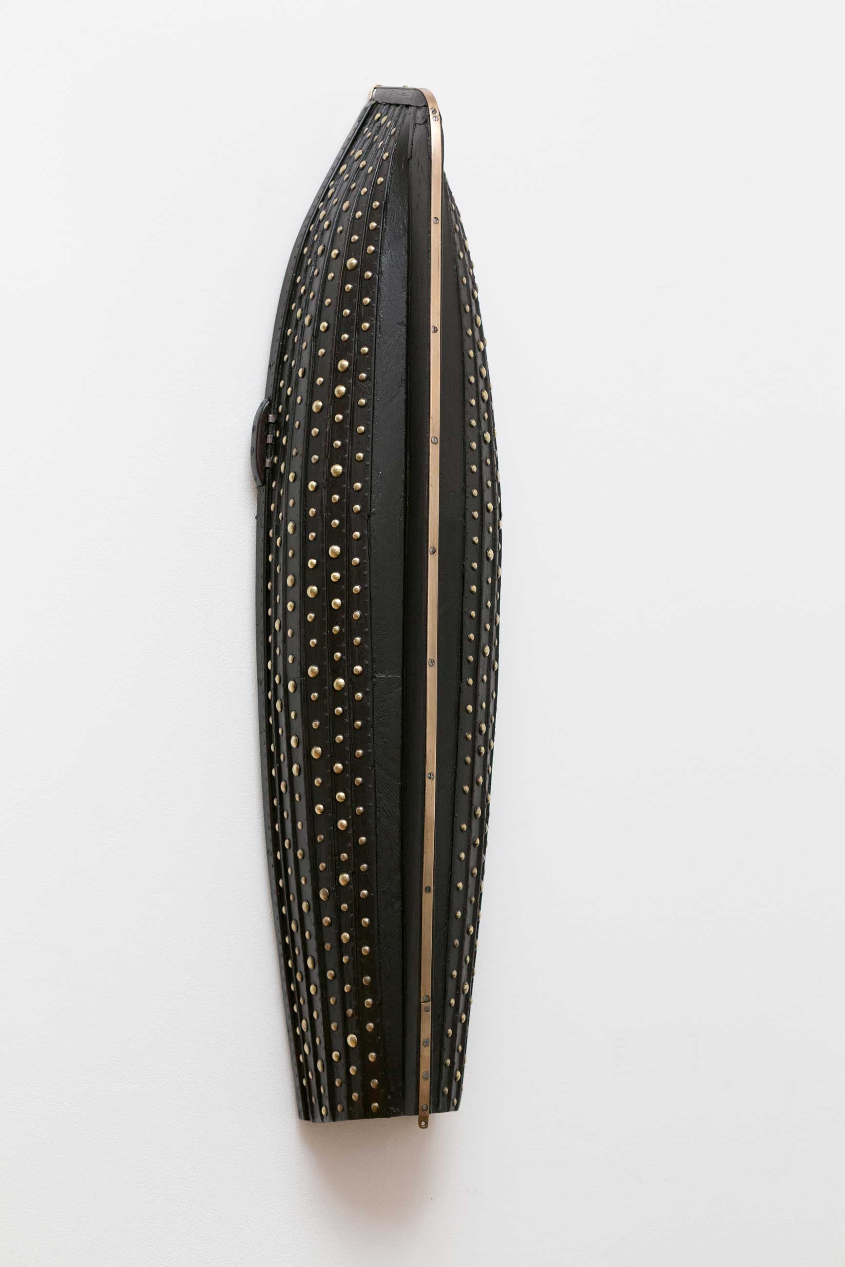 In her sculptures, LR Vandy (b.1958, England, of Nigerian/Irish descent) brings together both found and made objects in order to create new meaning. Vandy transforms model boat hulls into ‘masks’, animating them with various materials, including fishing floats, porcupine quills and acupuncture needles. The hulls allude to the transportation of migrants as commodities.