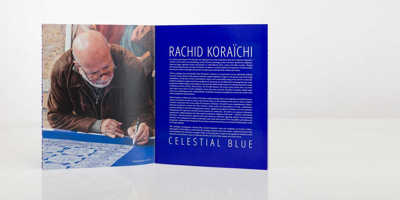 October Gallery first showed Koraïchi’s work in 2003 and has since presented five solo exhibitions of his work, amongst numerous group shows and external projects. In 2011, October Gallery collaborated with ADMAF to present Koraïchi’s masterpiece Path of Roses, dedicated to Rumi, in Abu Dhabi. In 2015, he completed work on his largest, installation to date, La Prière des Absents, honouring his parents. In 2021, Rachid bought agricultural land in Zarzis, Tunisia, with his daughters, Aïcha and Fatma, to create a memorial resting place, Jardin d’Afrique, for migrants of all nationalities and religions who died crossing the Mediterranean Sea in search of a better life.